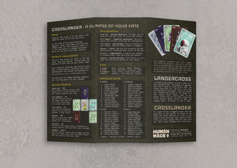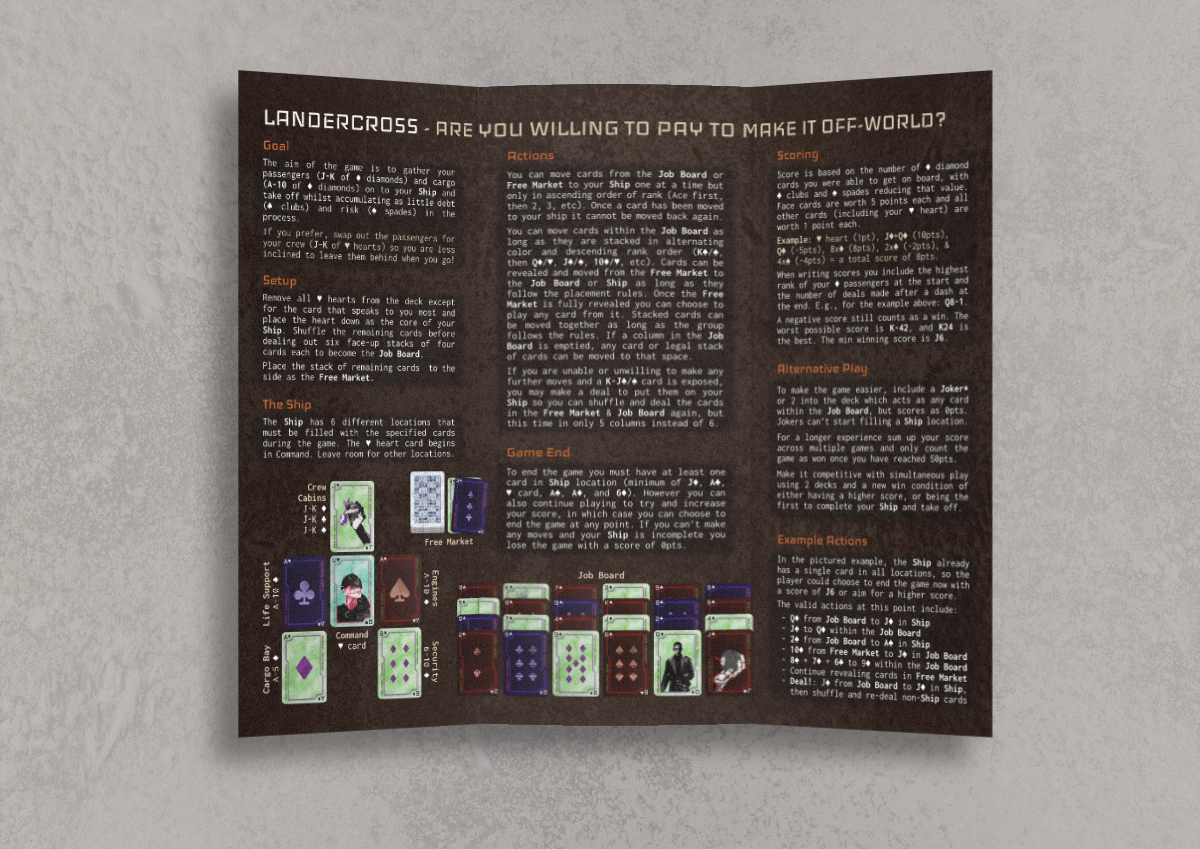 This free trifold pamphlet contains rules for 2 games that could be played in any science fiction setting using a standard deck of playing cards. LANDERCROSS is a solitaire scoring game where the player tries to fill their ship with valuable cargo while racking up as little risk and debt in the process. CROSSLANDER can be used as a divination or storytelling tool concerning an upcoming mission for a ship’s crew.
