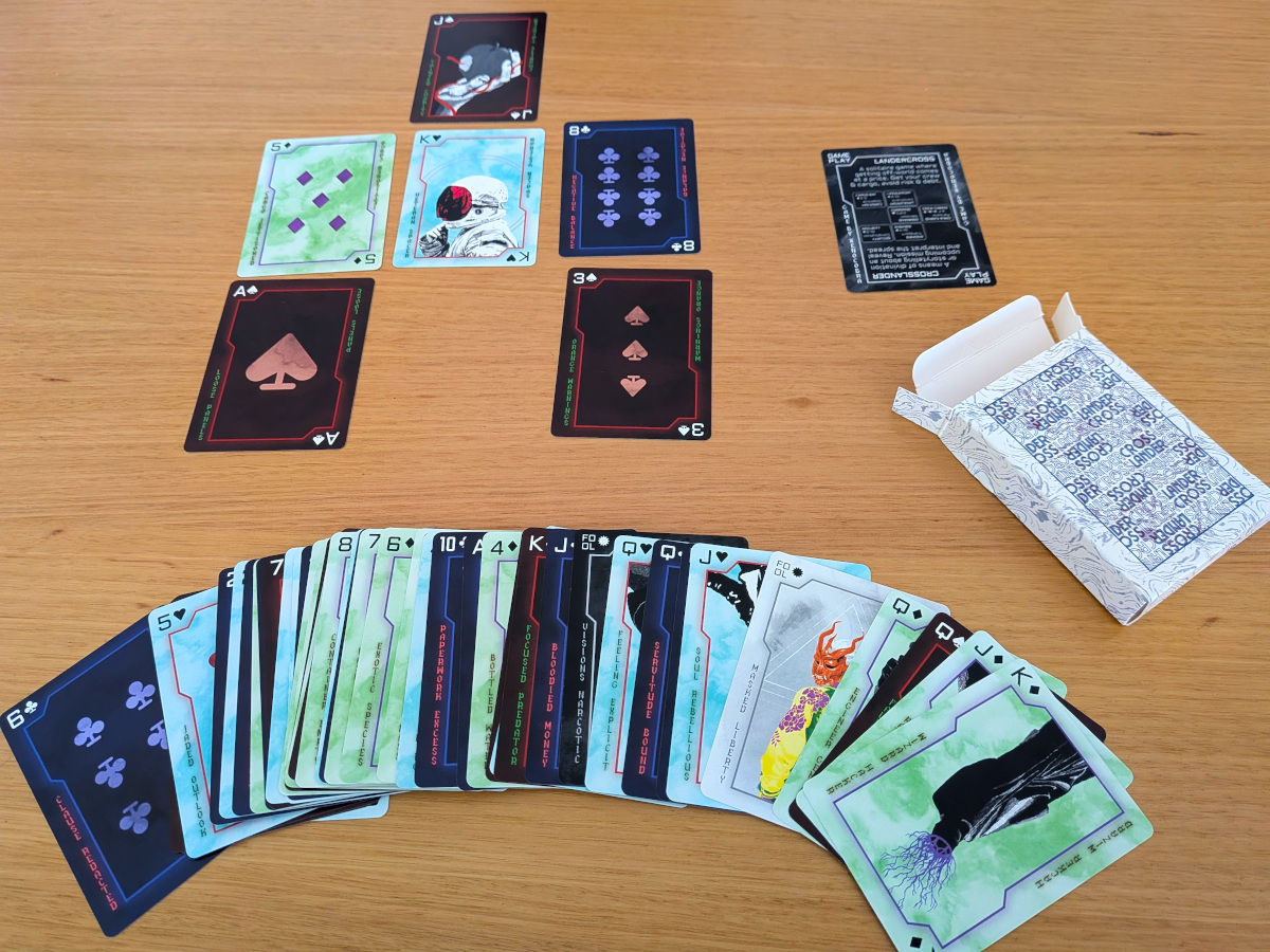You can play both games using a single standard 52-card deck of playing cards. I have also included purchasable image files for an entire deck of cards (and tuckbox) so that you can use them digitally or get a set printed like I did. These files include 55 cards (52 deck + 2 jokers + rules reference card) containing interpretation text for each card with the face cards and jokers featuring artwork by Strega Wolf van den Berg licensed under the Creative Comrades License Agreement 1.0.